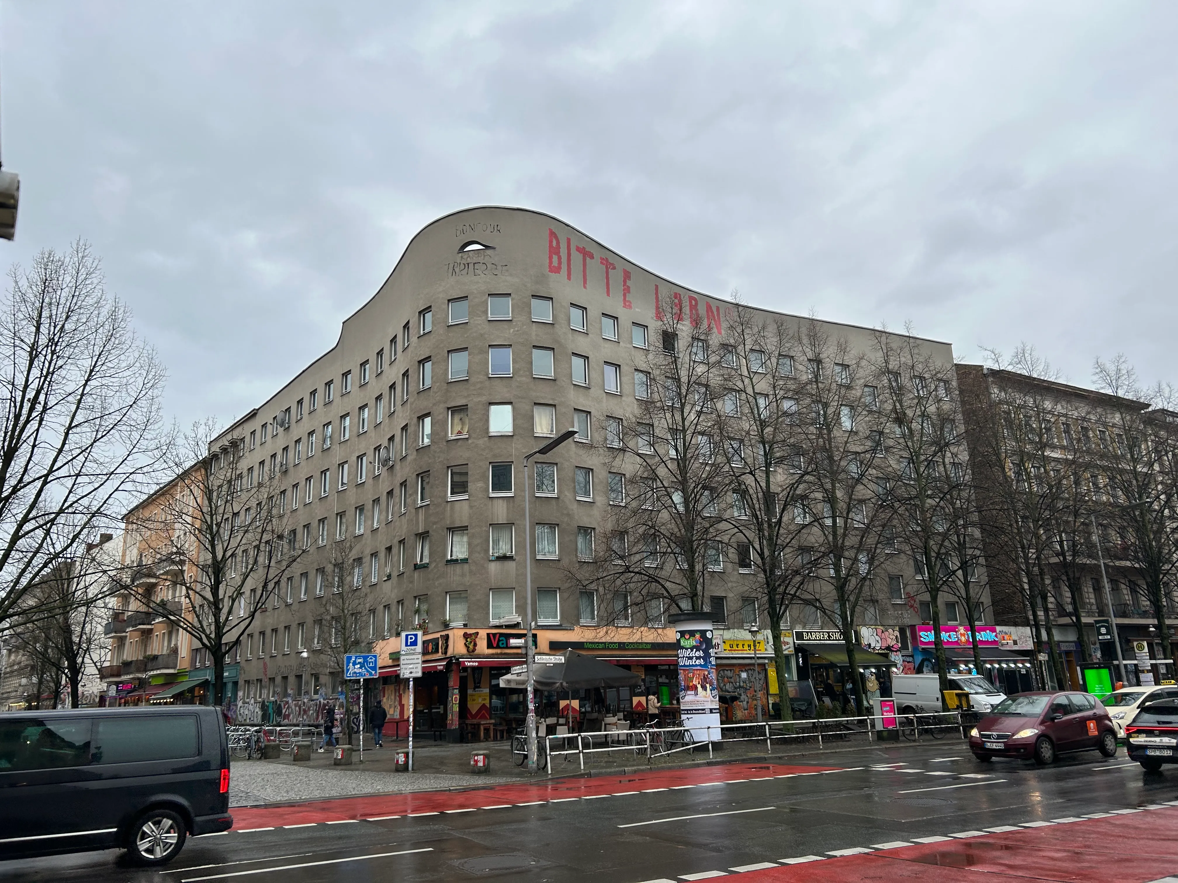Zur Bauzeit lag das Wohnhaus nur rund 100 Meter von der Berliner Mauer entfernt, was sicherlich zur damaligen Tristesse des Viertels beitrug. Heute ist die Gegend rund um das Schlesische Tor ein lebendiges, kreatives Zentrum Berlins – aber Bonjour Tristesse bleibt ein kühler Betonbau, der mit seiner trostlosen Ausstrahlung genau das verkörpert, was seine Kritiker einst auf den Giebel schrieben.